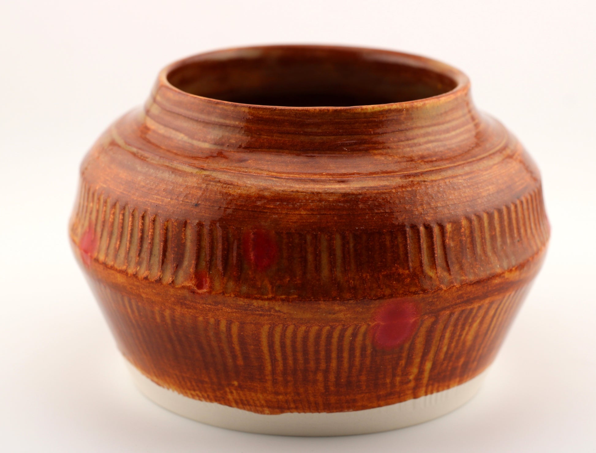 Homemade pottery. Wheel-thrown jar, red clay with brown speckled glaze. Piece is food safe however NOT microwaveable. Does not hold water but can be used for small air plants with minimal moisture. Can be used for trinkets or as an art piece. Hand wash, not dishwasher safe.