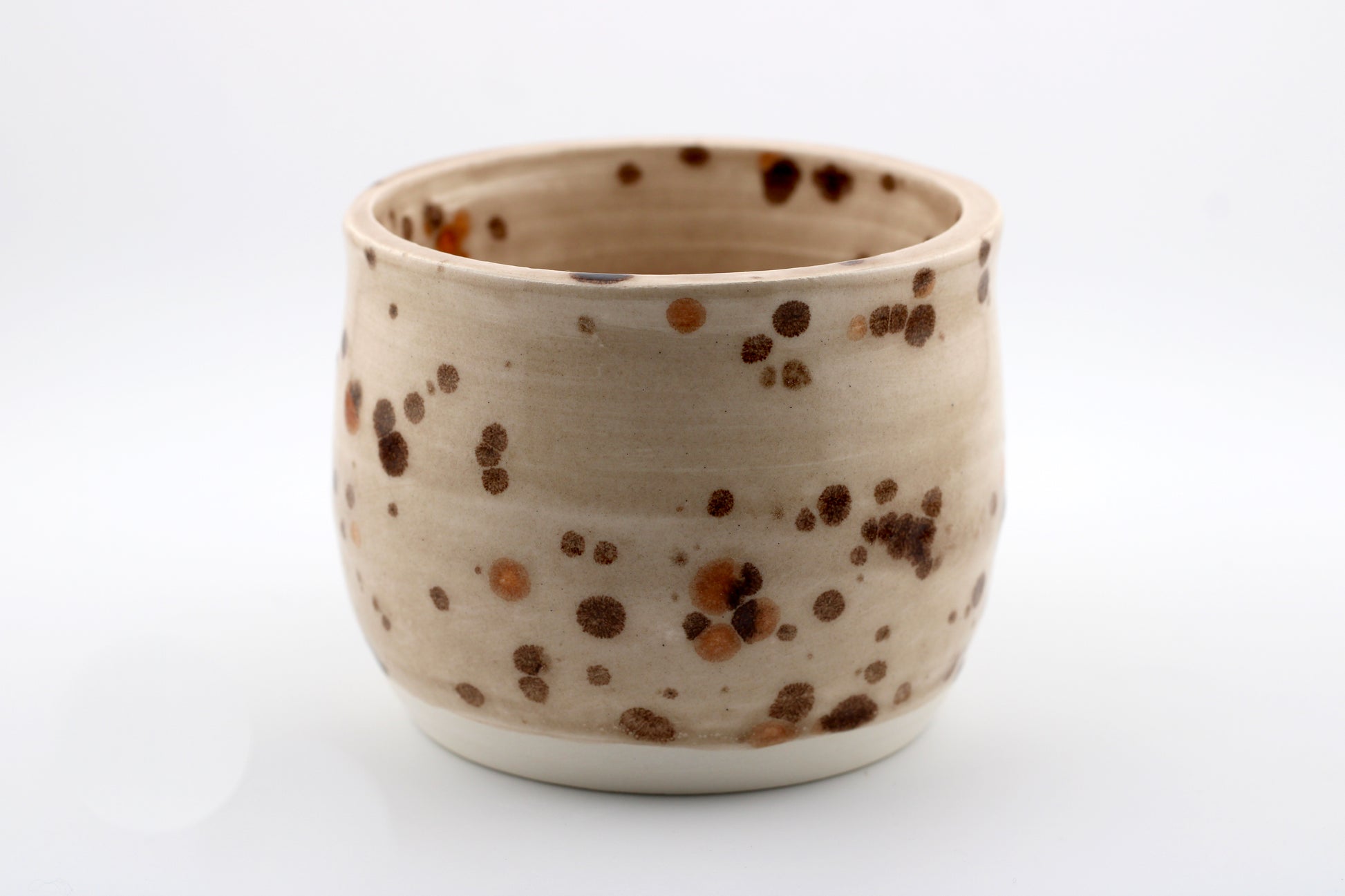 Homemade pottery. Wheel-thrown vessel, white clay with brown speckled glaze. Piece is food safe however NOT microwaveable. Does not hold water but can be used for small air plants with minimal moisture. Can be used for trinkets or as an art piece. Hand wash, not dishwasher safe.