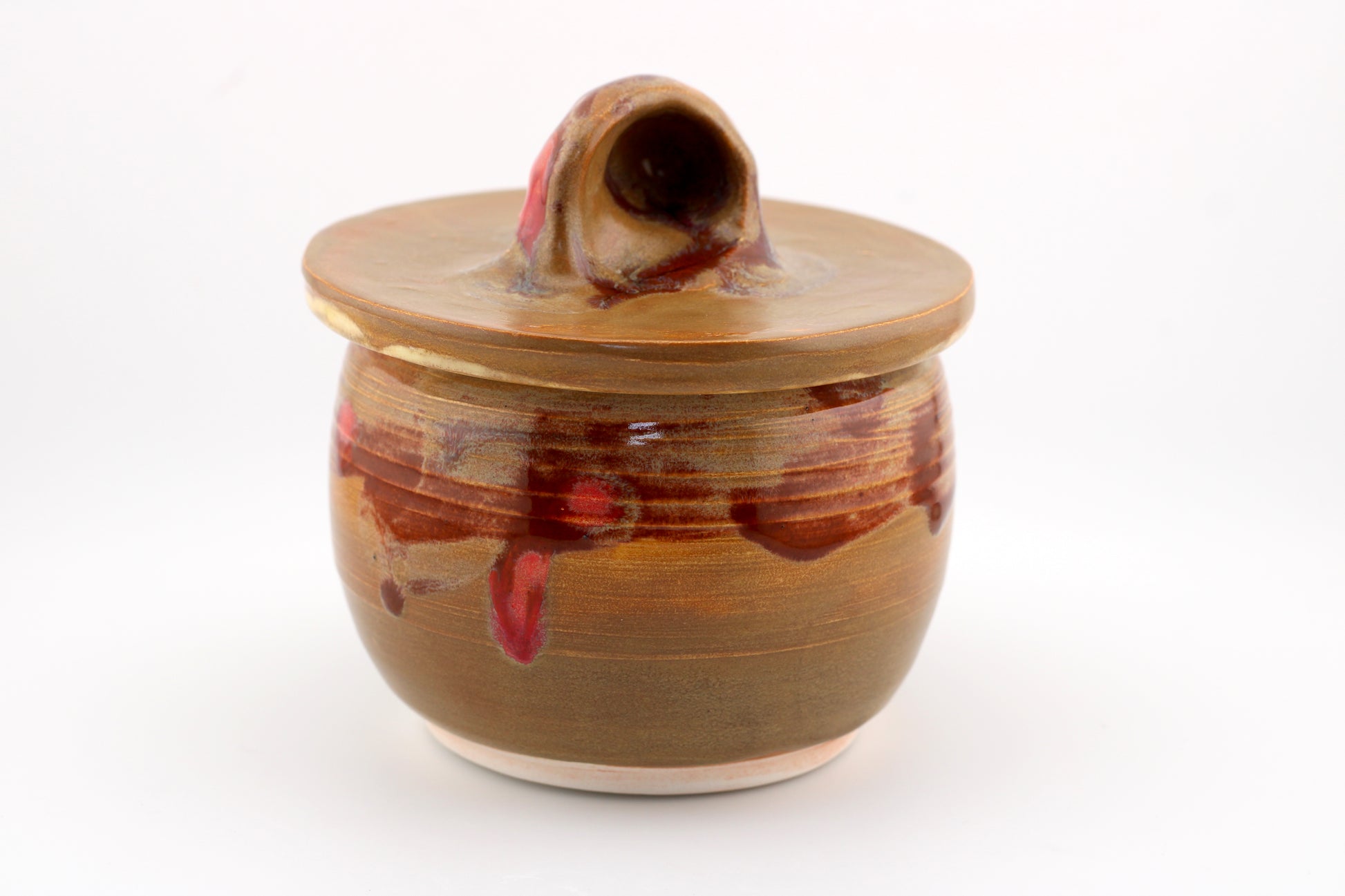 Homemade pottery. Wheel-thrown lidded vessel, white clay with brown speckled glaze. Piece is food safe however NOT microwaveable. Can be used for trinkets or as an art piece. Hand wash, not dishwasher safe.