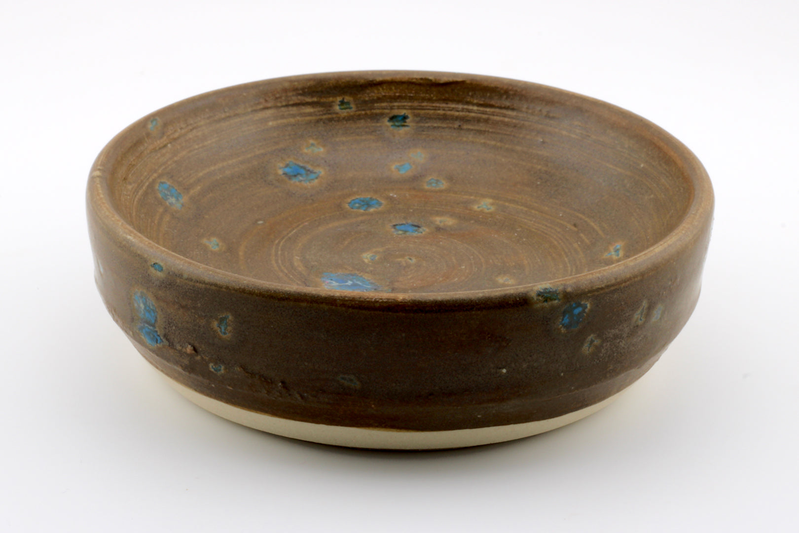 Handmade pottery dish. Wheel thrown white clay sauce dipping dish with brown speckled glaze. Approx. 4.0 in. W x 1.0 in. H. Functional Stoneware. Food safe, handwashing recommended.