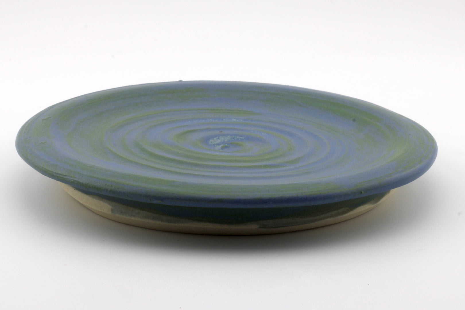 Handmade wheel thrown white clay coaster with blue glaze. Approx. 4in. W. Functional Stoneware. Food safe, handwashing recommended.