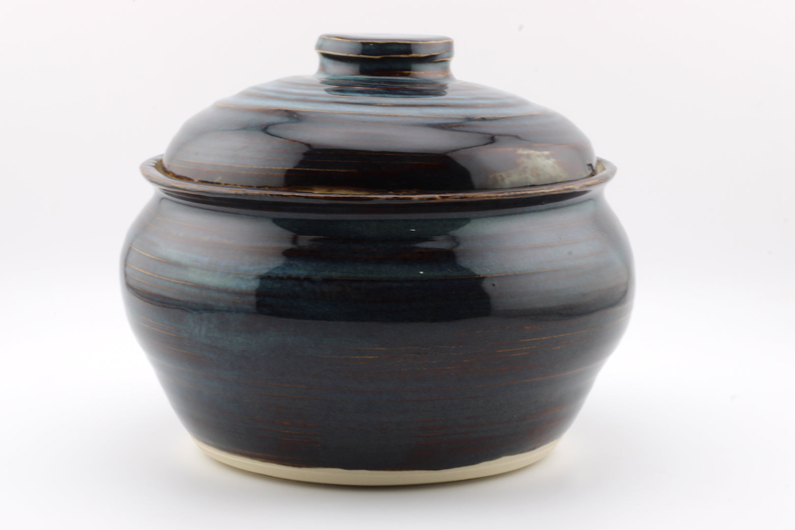 Handmade Pottery lidded jar. Wheel thrown white clay jar with blue-green glaze. Approx. 6.0 in. W x 4.5 in. H. Functional Stoneware. Food safe, handwashing recommended.