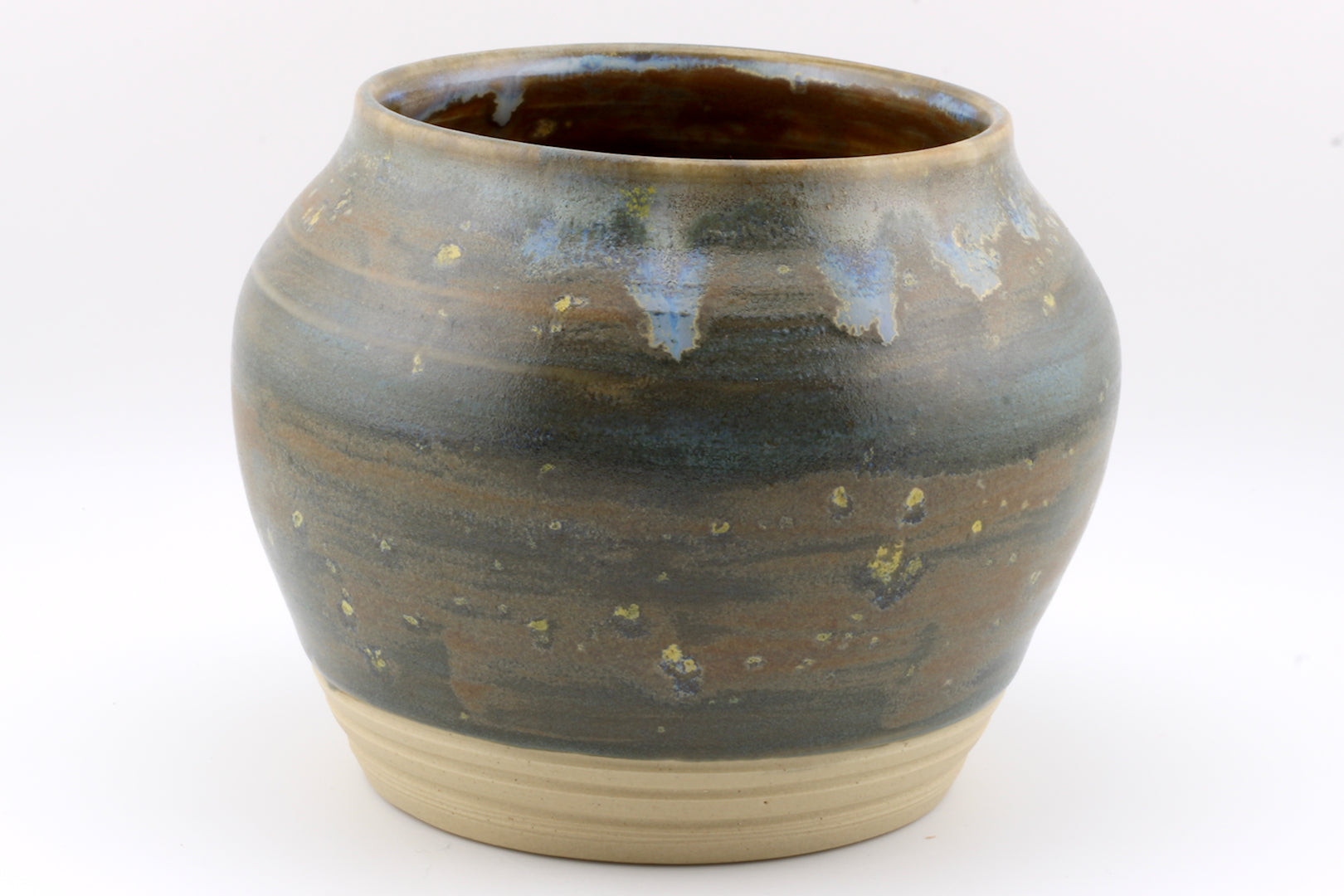 Handmade wheel thrown white clay jar with brown and blue speckled glaze. Approx. 4.5 in. W x 3.5 in. H. Functional Stoneware. Food safe, handwashing recommended.