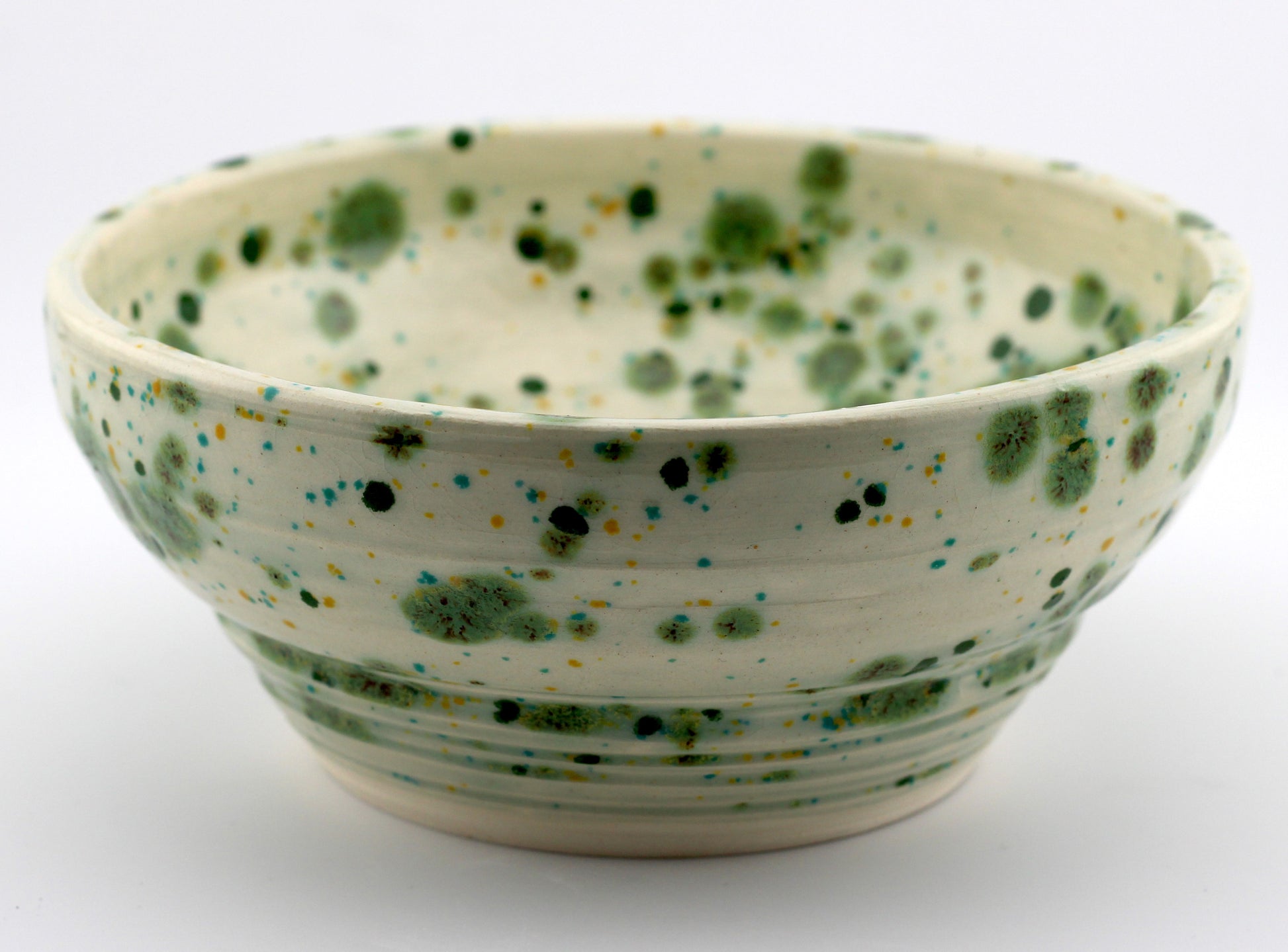 Handmade pottery. Wheel-thrown bowl, white clay with green speckled glaze. Piece is food safe however NOT microwaveable. Can be used for trinkets or as an art piece. Hand wash, not dishwasher safe.